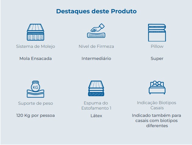 Modelo Divino Luxury LátexSistema de Molejo Mola EnsacadaNível de Firmeza IntermediárioSuporte de peso 120 Kg por pessoaTamanho SolteiroLargura 88 cmIndicação Biotipos Casais Indicado também para casais com biotipos diferentesEspuma do Estofamento 1 LátexEspuma do Estofamento 2 D33 PróPillow SuperTecido Tampo Malha HD Branca com detalhes CinzaGramatura Tecido 250 g/m²Tecnologia Extra do Tecido ViroCleanComprimento 188 cmAltura 36 cmEspuma Matelassê D24 Soft GelBase de Suporte do Colchão EspumaManutenção No turnGarantia 12 Meses Molas e espuma, 3 Meses TecidoCertificação Inmetro Certificado conforme Portaria Inmetro Nº 75/2021